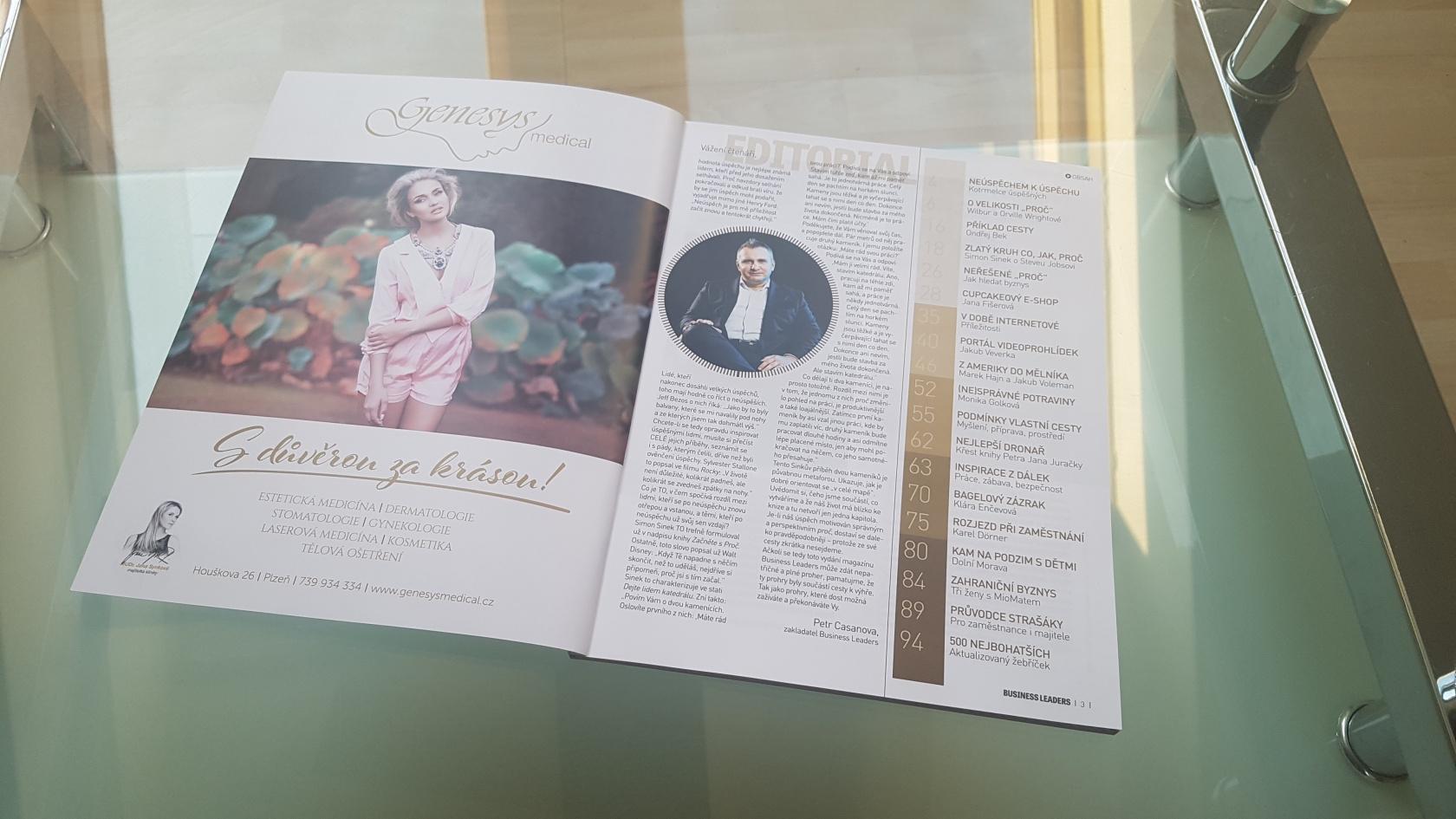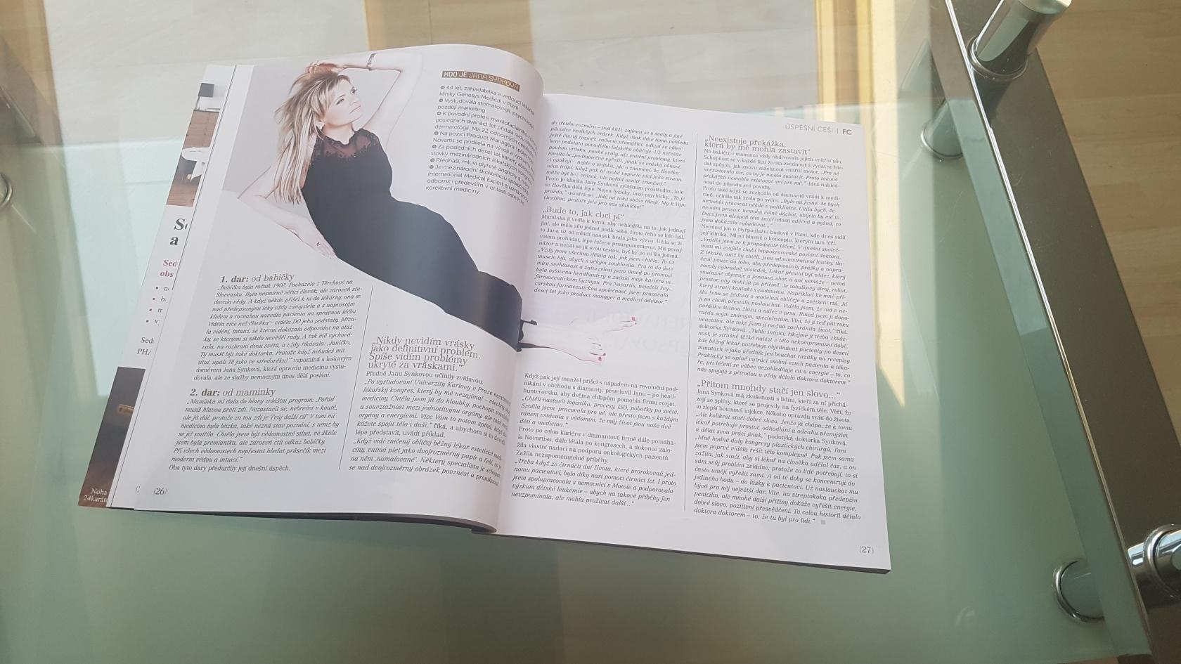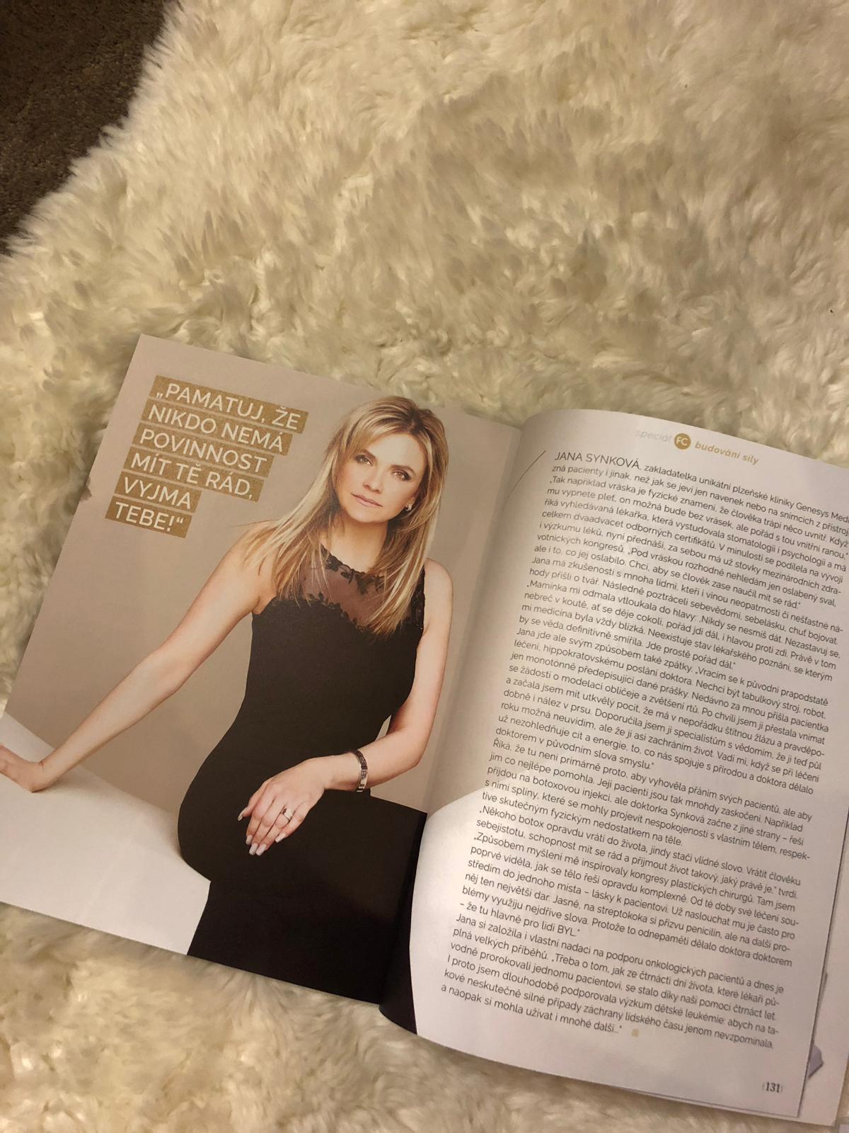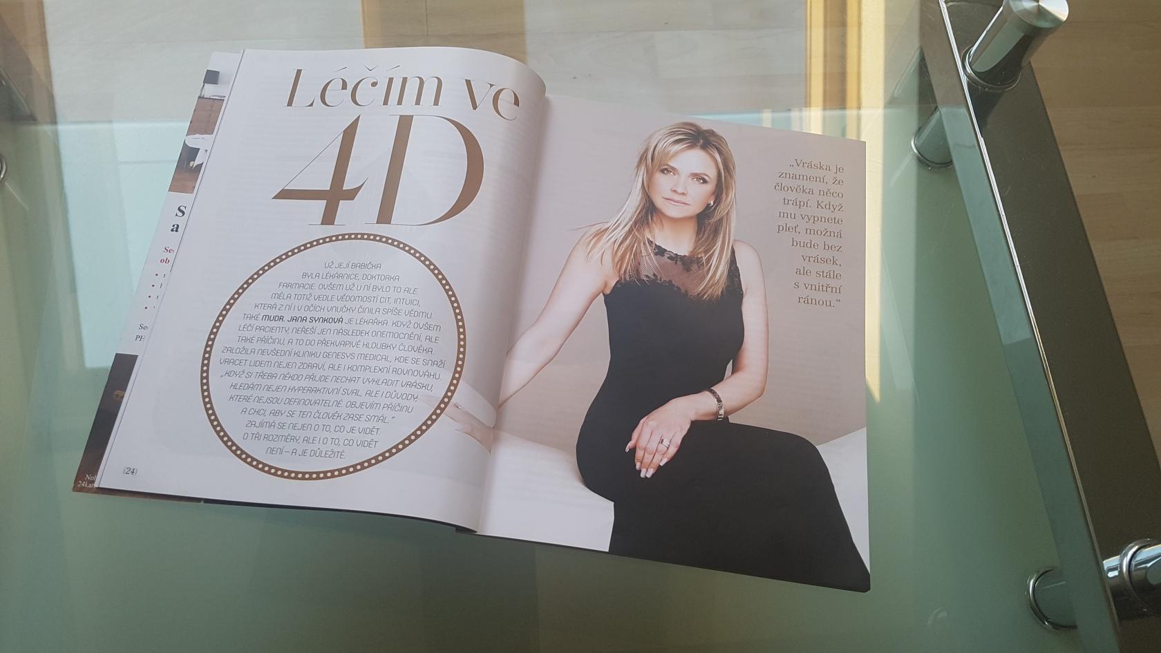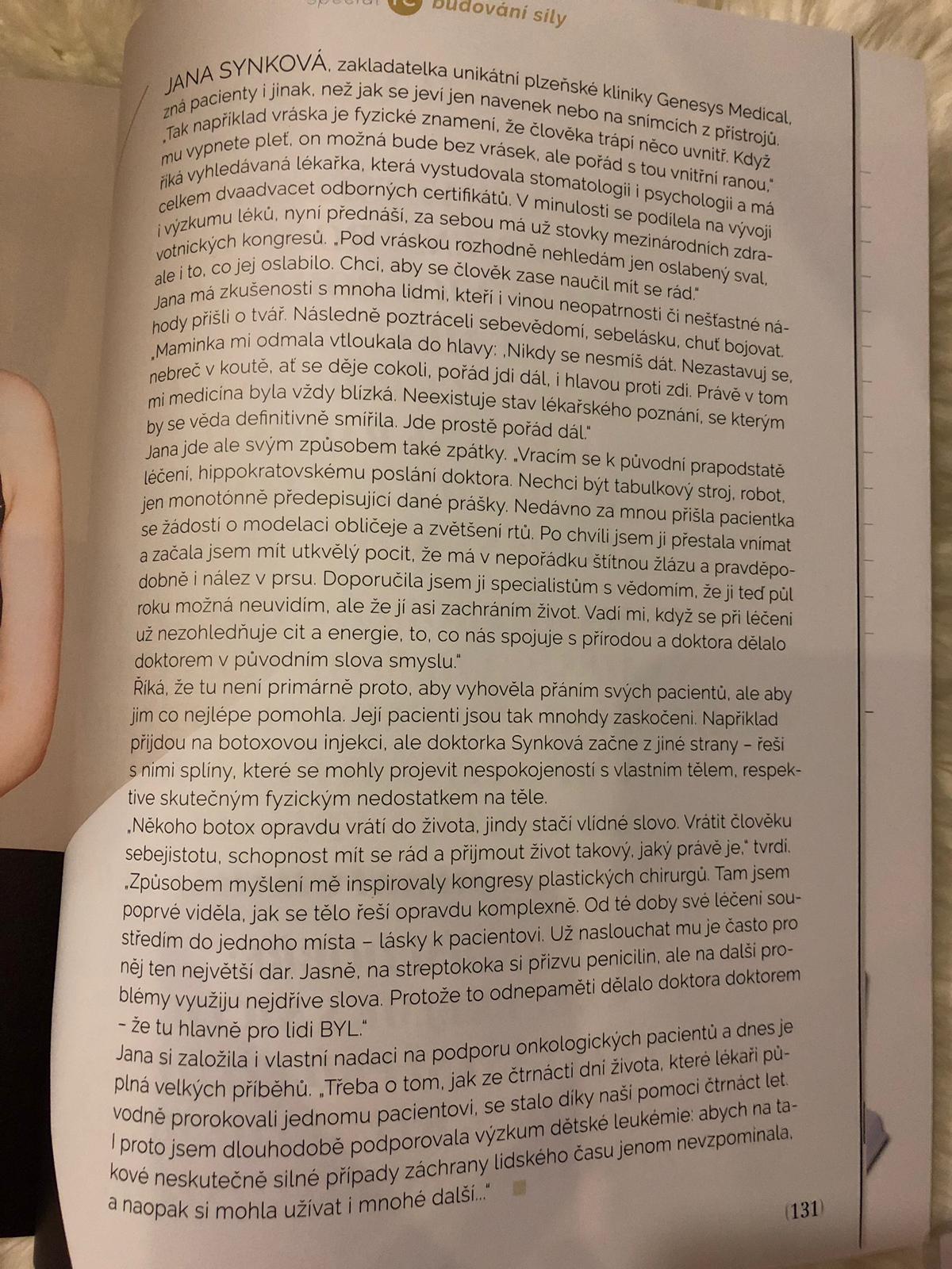 Pokud sníte o bílém chrupu, měli byste vědět, co bělení obnáší a jak zuby předem připravit přejít na článek Dentální hygiena je vhodná již pro děti od 3 let. Správná prevence zamezí kazu a je bezbolestná přejít na článek ŽENY S.R.O.: Nejde jen o krásu, ale především o zdraví člověka, říká primářka kliniky estetické medicíny přejít na článek FC 11/2018 MUDr. Jana Synková: "Pamatuj, že nikdo nemá povinnost mít tě rád, vyjma Tebe!" BUSINESS LEADERS 4/2018 FC 1/2018 MUDr. Jana Synková: "Léčím ve 4D" Magazín Business Leaders Adventní příloha MF DNES - "Genesys Medical, tak trochu jiná klinika." přejít na článek